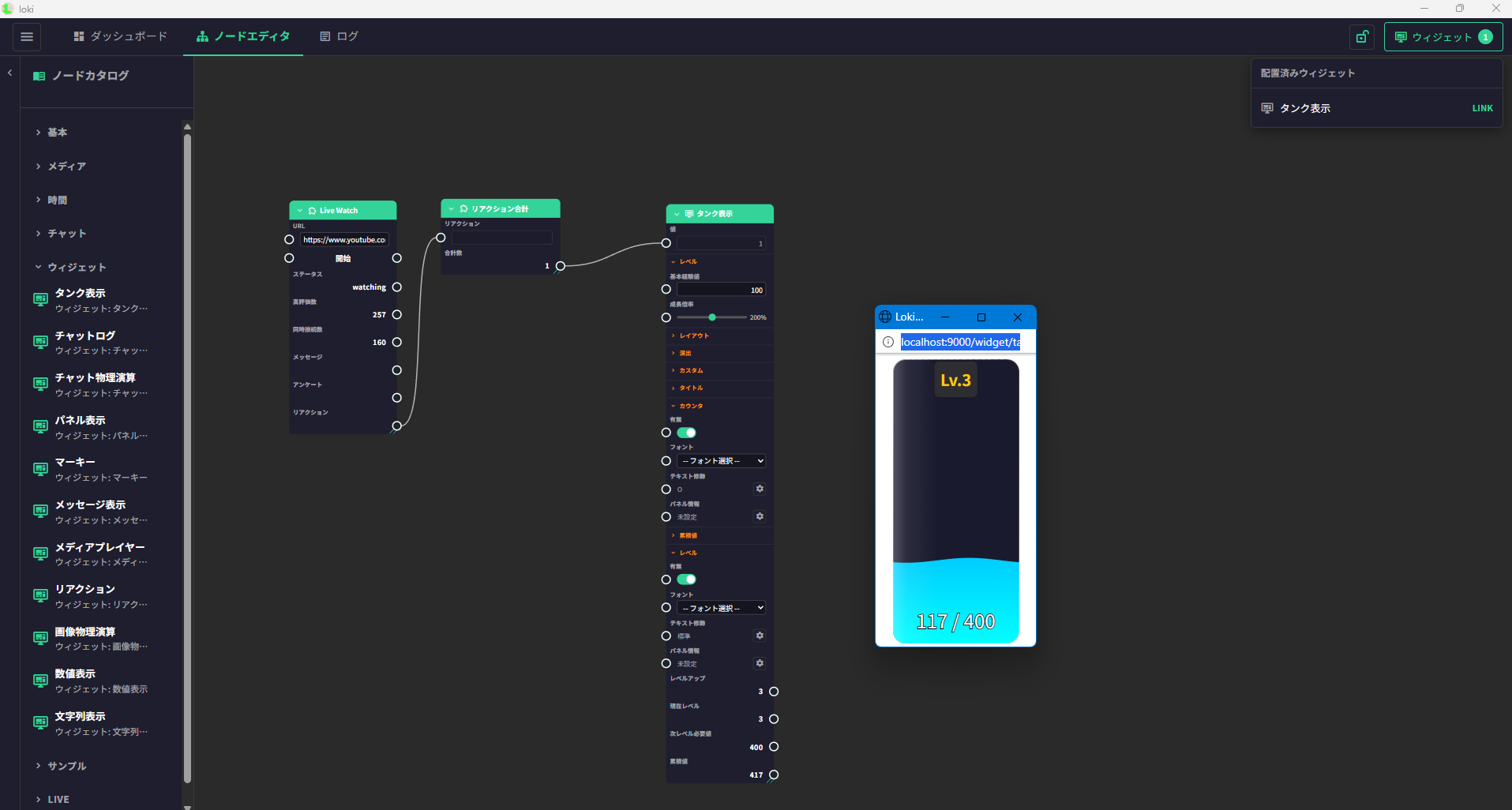 ノードエディタで組んだデータがリアルタイムにウィジェットに反映され、配信画面を動的に演出できます。